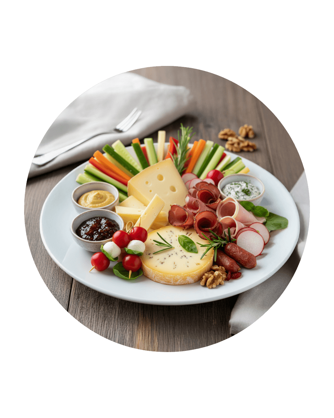 Assortiment de fromages suisses, charcuteries fines, mini-brochettes, crudités et condiments maison.